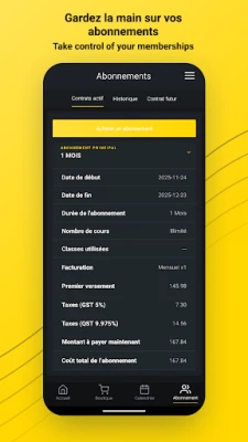 Ar Gold's Gym Québec lietotni, sporta zāles apmeklējums kļūst nepārspējami ērts. Izmantojiet digitālo caurlaidi, lai ātri un bez problēmām iekļūtu jebkurā Gold's Gym Québec filiālē. Jūsu dalība ir pilnībā jūsu kontrolē: aplūkojiet, mainiet vai uzlabojiet savu abonementu dažu sekunžu laikā. Pārraugiet finanšu aspektus, pārskatot rēķinus un droši veicot maksājumus tieši lietotnē. Turklāt vairs nepalaidīsiet garām iecienītās grupu nodarbības, jo varat ērti pārlūkot grafiku un rezervēt savu vietu.
