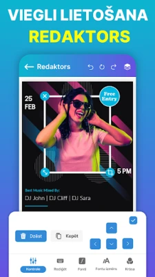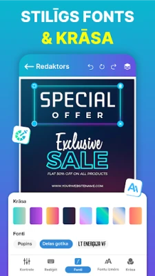 Lietotnes "Izpārdošanas plakātu un skrejlapu veidotājs" sirds ir tās plašā, iepriekš izstrādāto veidņu kolekcija, kas piemērota visdažādākajiem gadījumiem – no biznesa akcijām un korporatīviem paziņojumiem līdz svinību ielūgumiem un personīgiem notikumiem. Izvēlieties fonu no plašās bibliotēras vai augšupielādējiet savu attēlu, lai piešķirtu darbam unikālu pieskārienu. Pielāgojiet tekstu, izmantojot daudzveidīgus fontus un stilus, pievienojiet spilgtus efektus un tematiskas uzlīmes. Vairāku slāņu atbalsts ar bloķēšanas un atbloķēšanas iespējām nodrošina precizitāti un kontroli pār katru detaļu, ļaujot realizēt jebkuru radošo ideju.